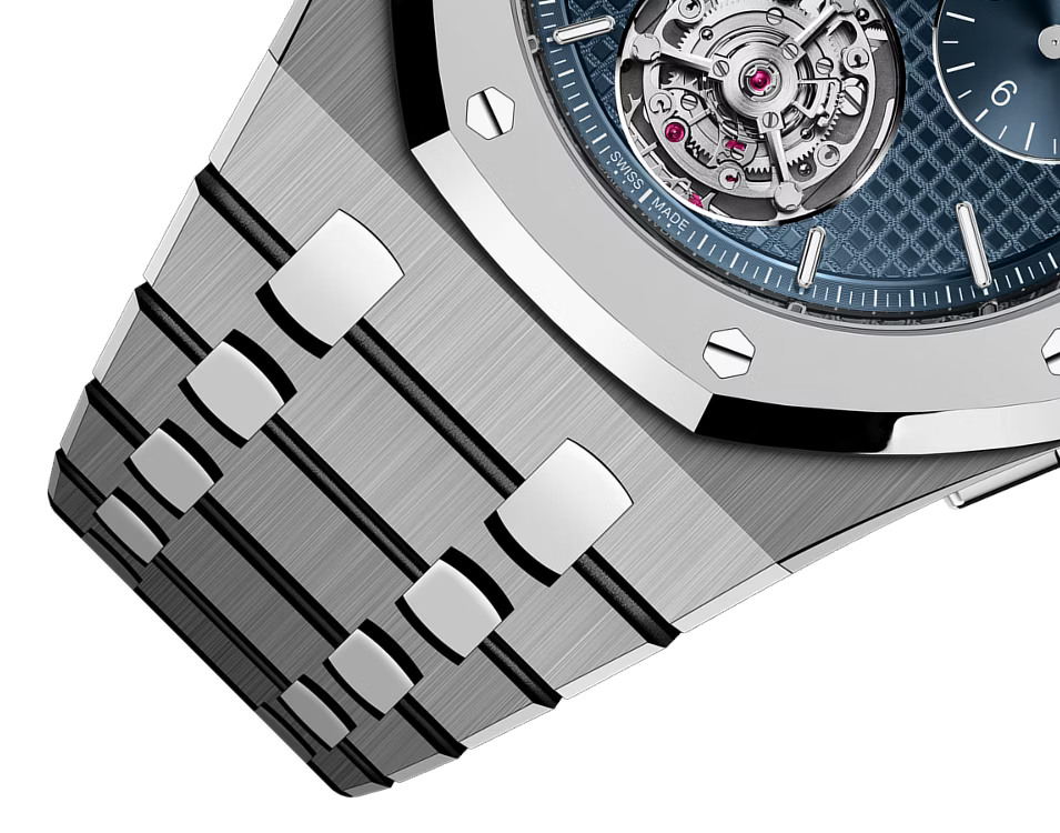 The integrated titanium bracelet flows seamlessly from the case, but the addition of BMG links (Bulk Metallic Glass, a high-tech alloy with remarkable hardness and sheen) gives it both durability and a unique tactility. The AP folding clasp clicks shut with the kind of finality that only decades of refinement can produce.
