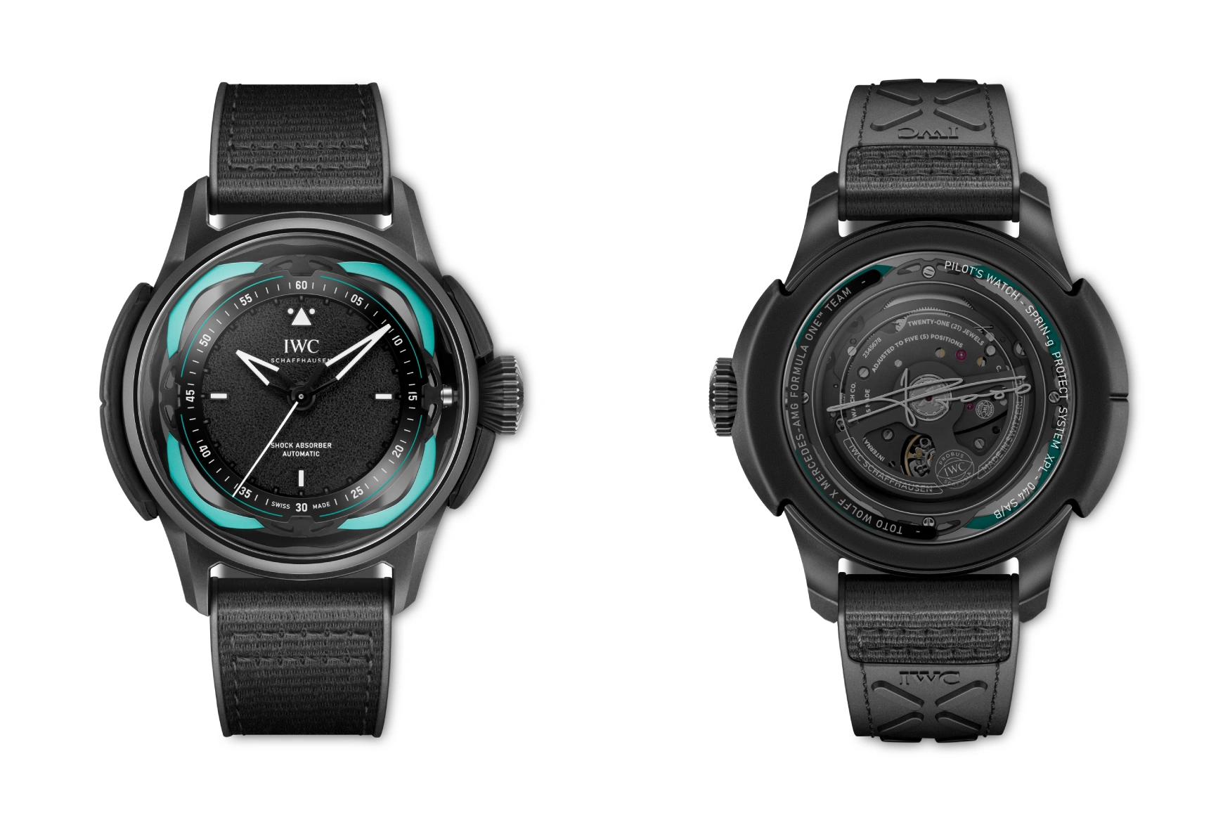 And there, on your wrist, sits the Model Big Pilot’s Watch Shock Absorber XPL Toto Wolff x Mercedes-AMG Petronas Formula One Team, reference IW356201—a jaw-dropping collaboration between Mercedes and IWC. Its 44mm x 12mm case, forged from IWC’s tough and durable Ceratanium (a brilliant mix of titanium and ceramic), feels light yet indestructible, its matte black finish radiating stealthy sophistication that mirrors the car’s fierce vibe. Water-resistant to 100 meters, it boasts a screw-down crown and a sapphire crystal caseback, etched with Toto Wolff’s signature—a subtle flex of F1 royalty. The Petronas green rubber strap (or the optional black rubber combo) secures it with a pin buckle, its vibrant hue popping against the dial, which is textured like the racetrack itself. The triangular hands and shock-absorbing spring glow with Petronas green Super-LumiNova, catching your eye as you revel in the moment.