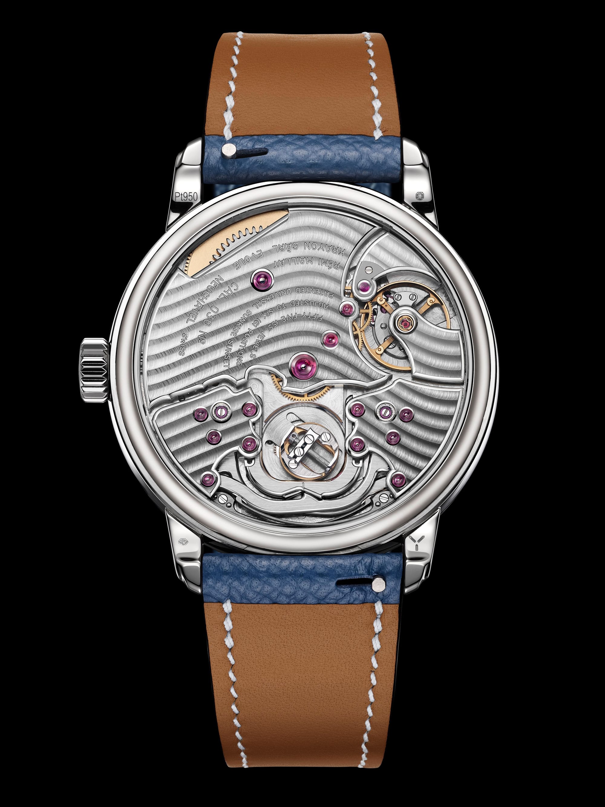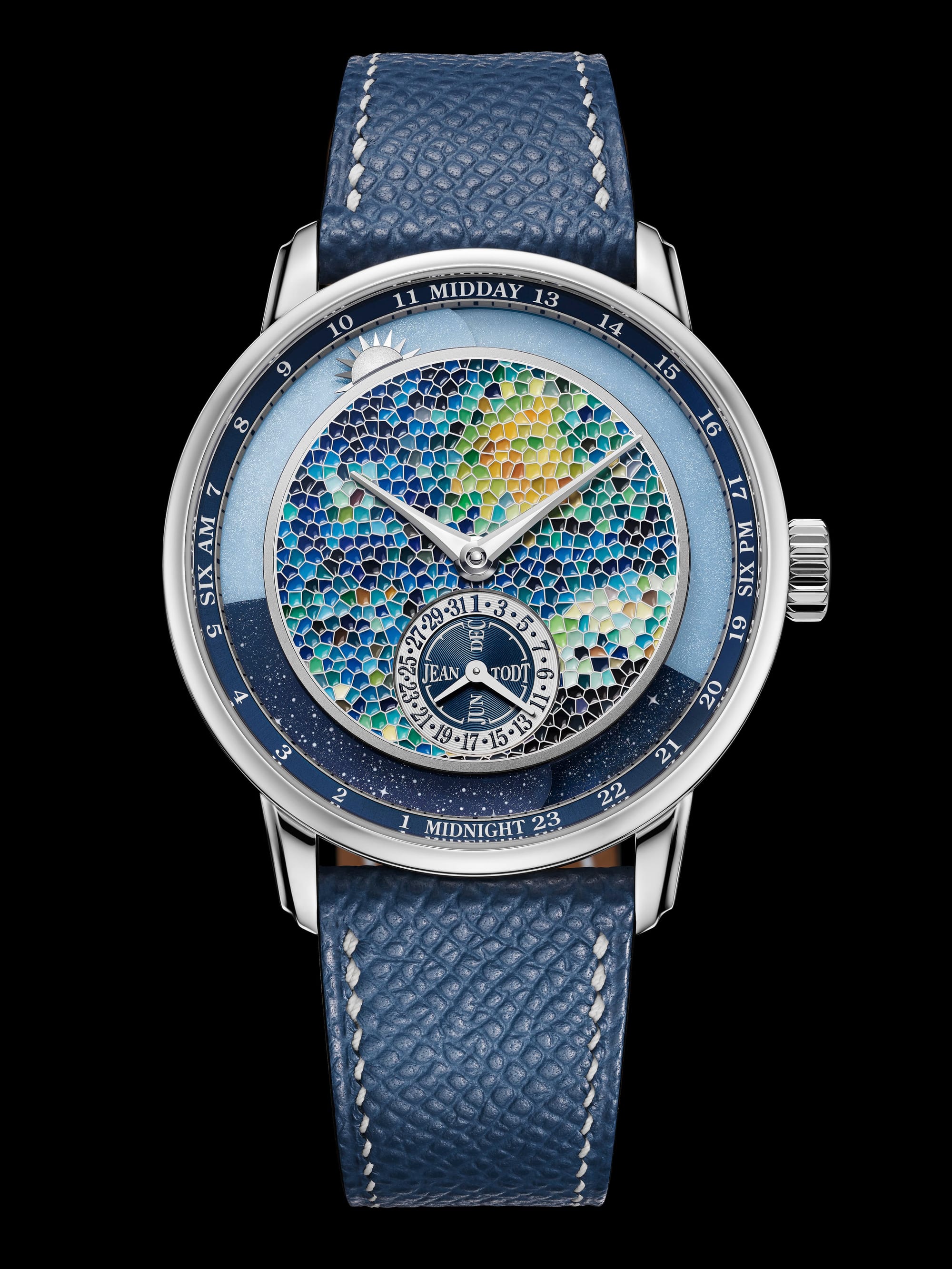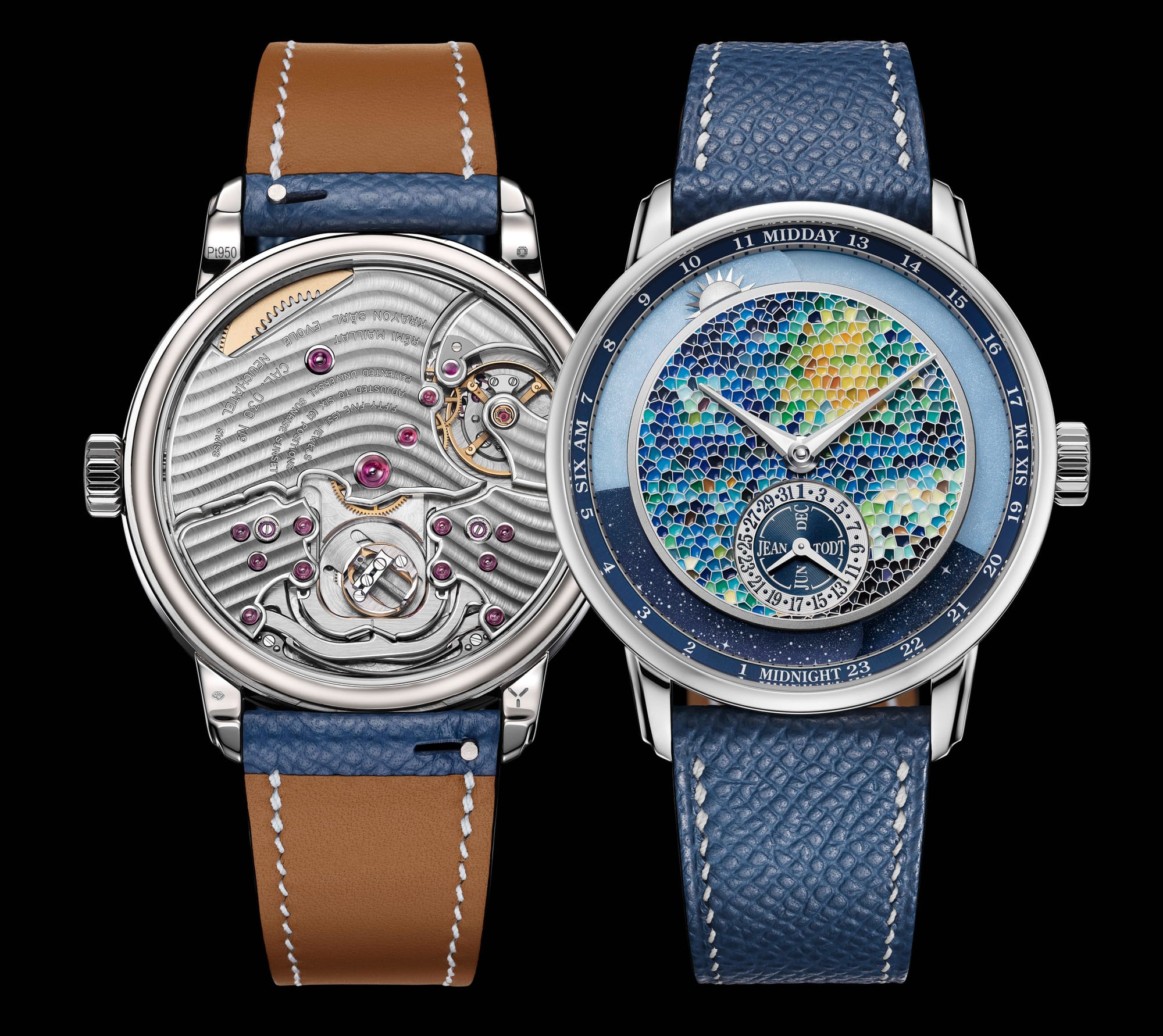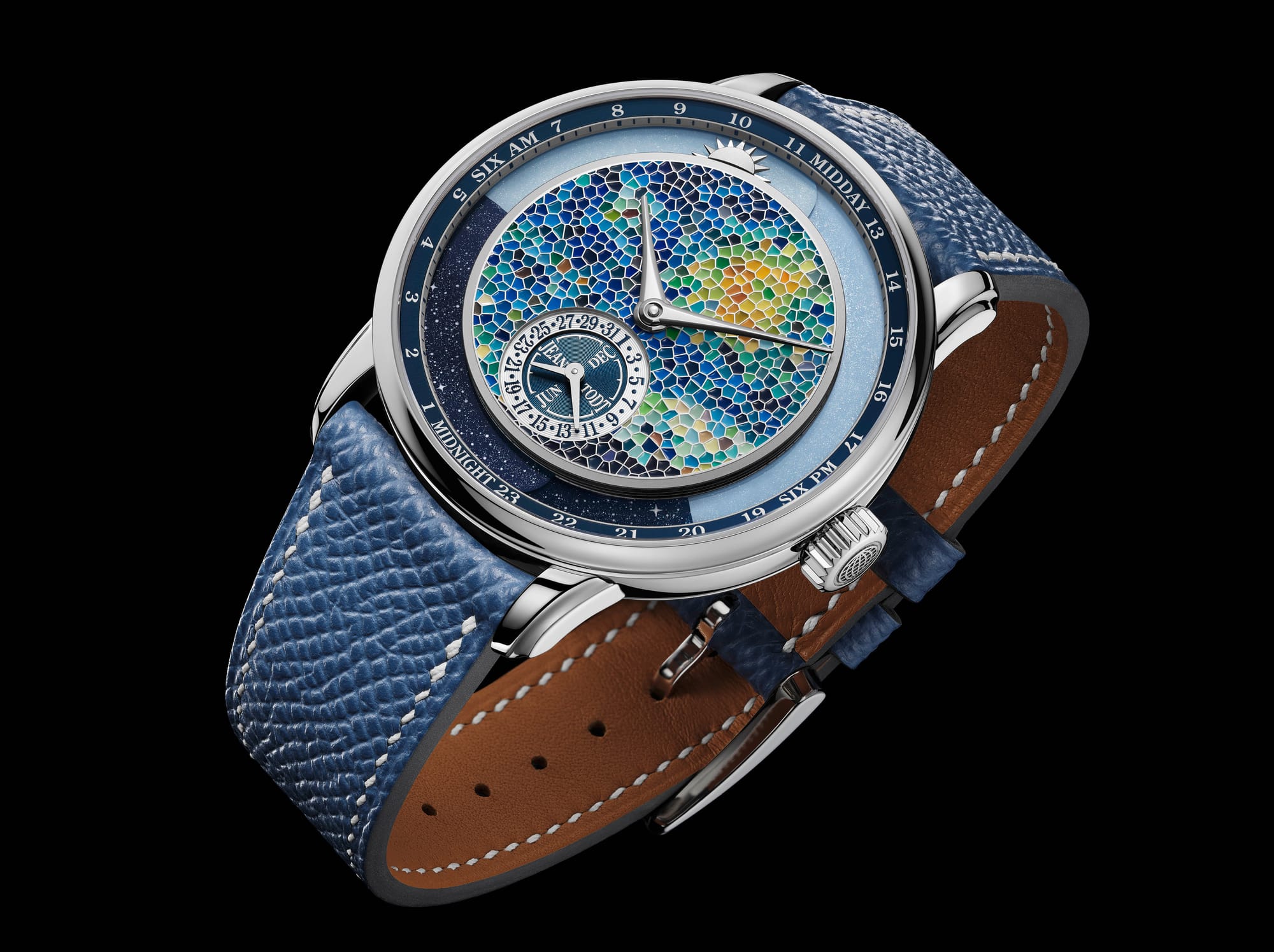 The Anywhere is a marvel that wraps the wrist in luxury and sophistication. Its case, forged from the finest 950 Platinum, measures a tasteful 39 mm x 9.5 mm, offering a presence that is both commanding and comfortable. The dial is a canvas of colors, meticulously hand-painted to depict the transition from day to night, embodying the essence of van Gogh’s masterpiece.