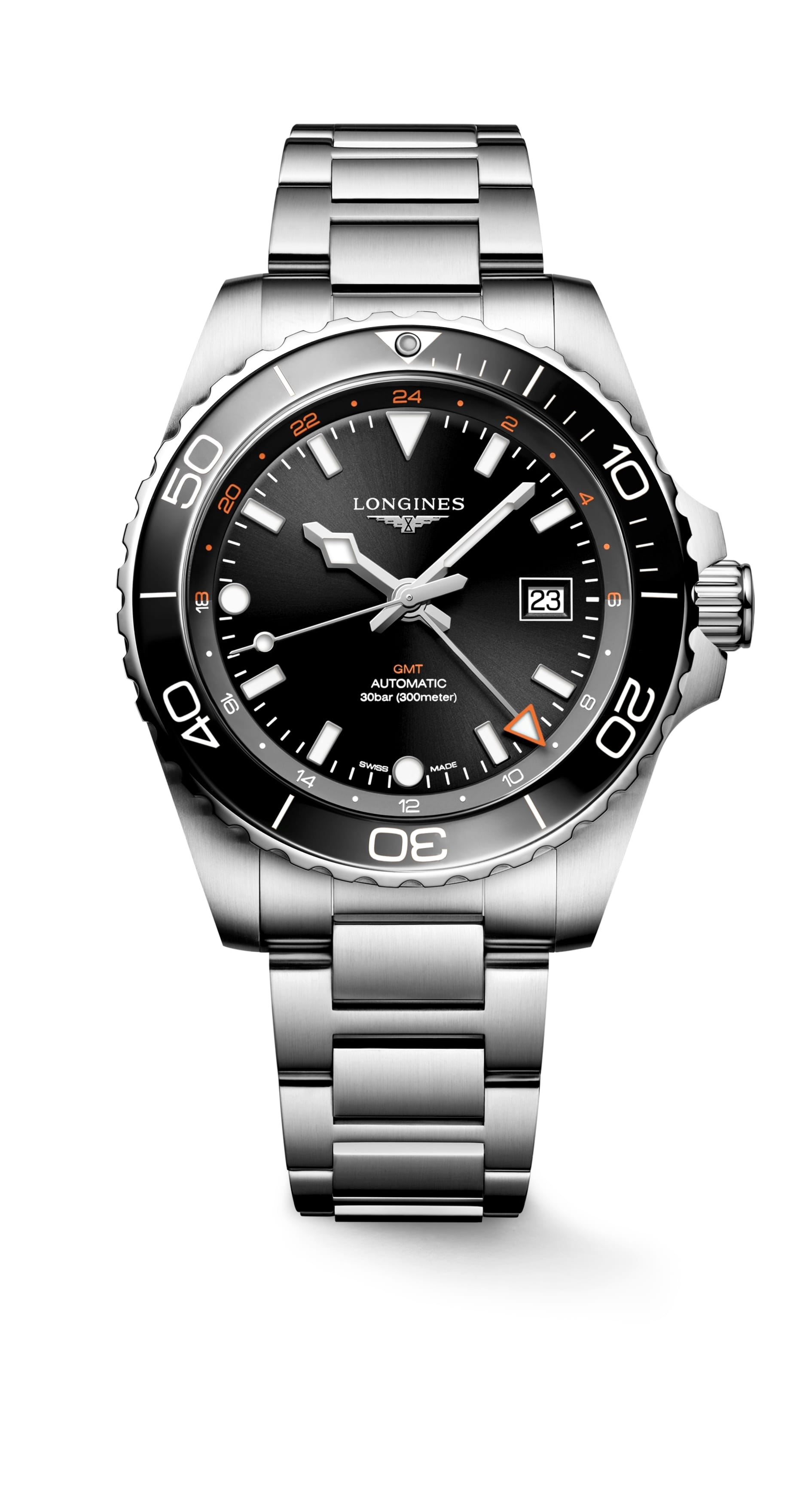 Choose between a stainless steel bracelet or a black rubber strap, both secured with a double security folding clasp and microadjustments. Whether you’re diving into the ocean or exploring city streets, the HydroConquest GMT stays comfortably on your wrist.