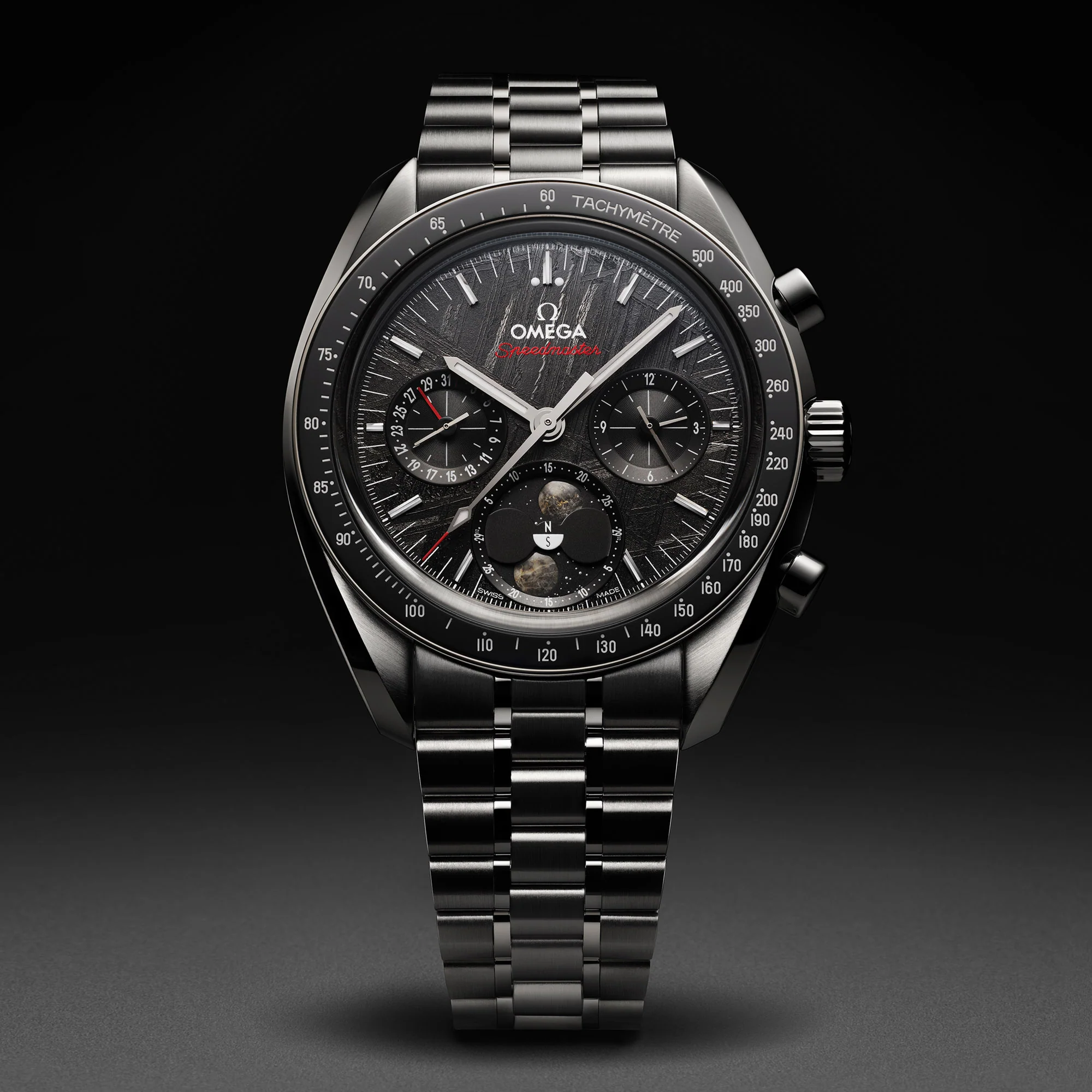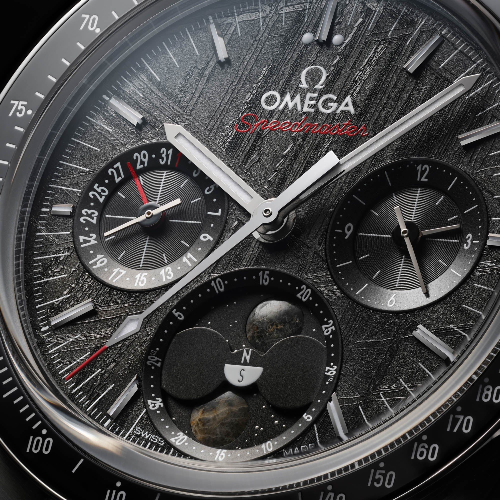 The Speedmaster Moonphase Meteorite comes in two distinct variations - one with a black meteorite dial and the other with a galvanic grey meteorite dial. Both dials are crafted from genuine iron meteorite, adding an otherworldly and captivating element to the watch's design.