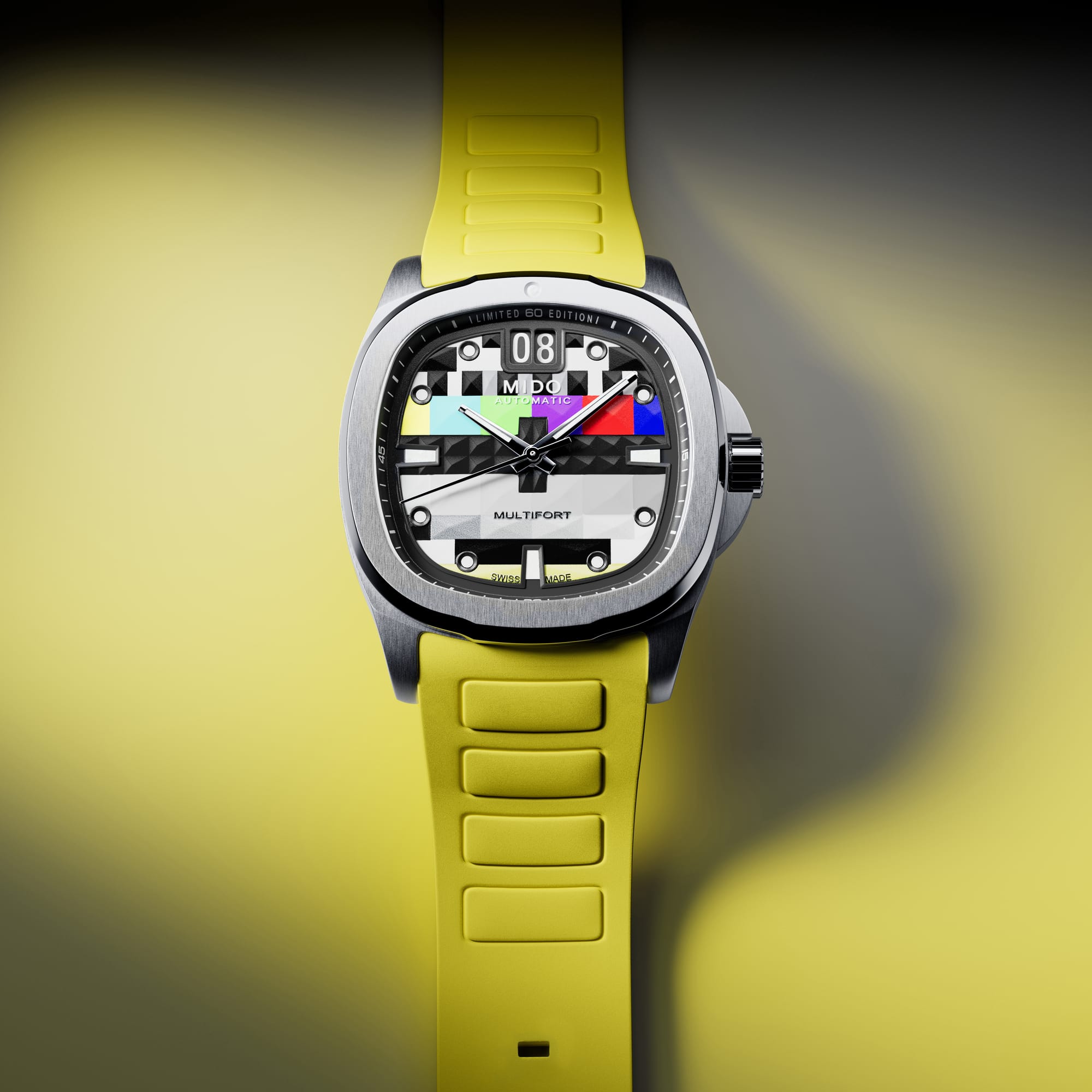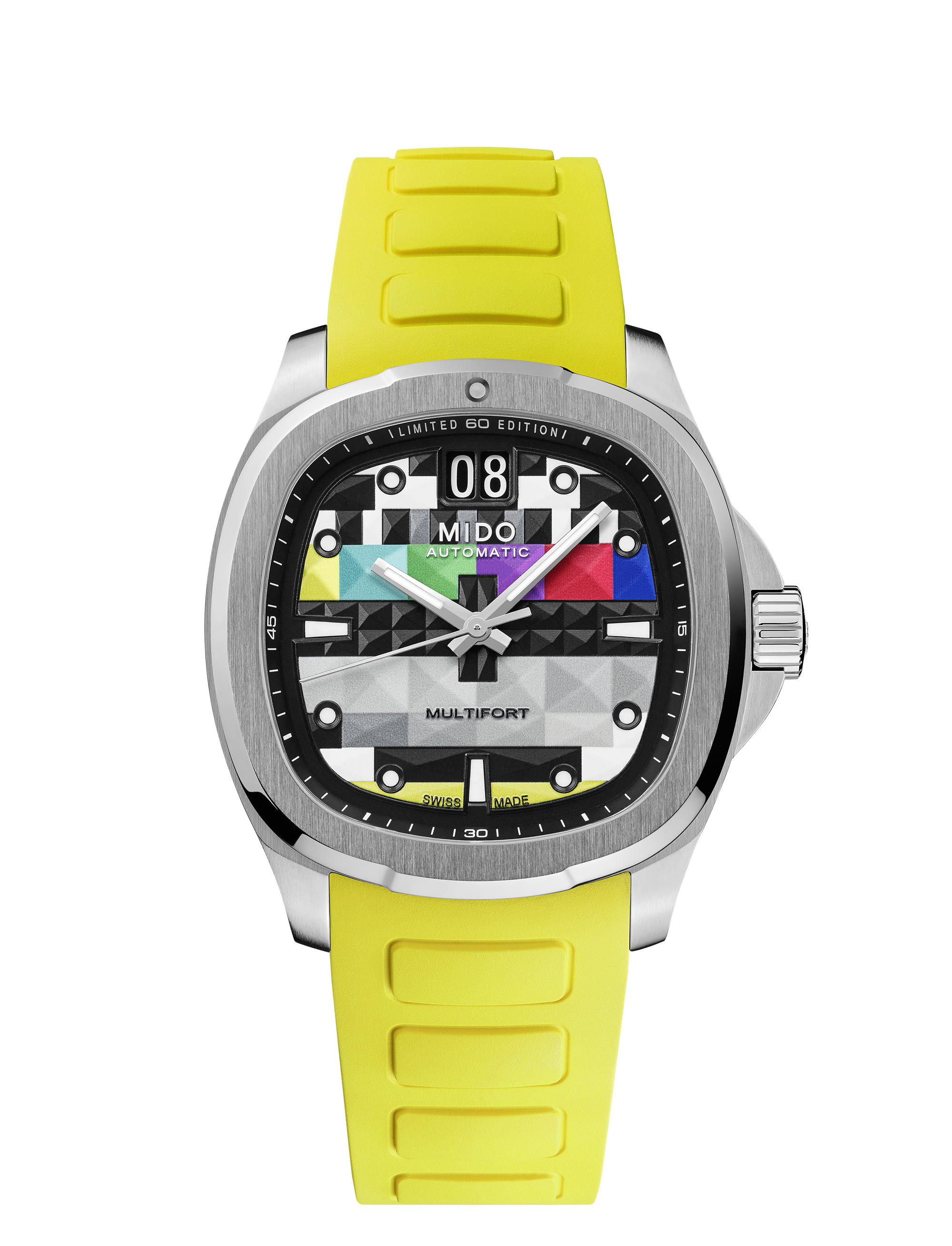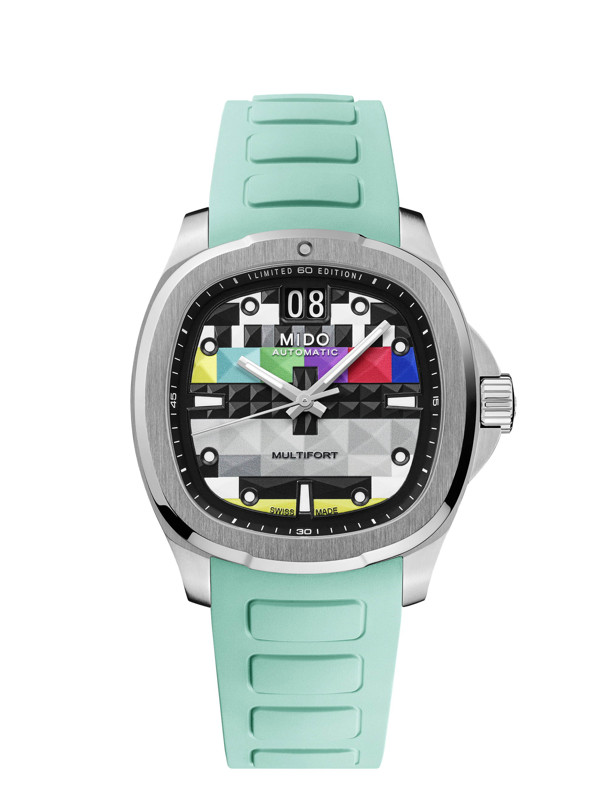 The Multifort TV Big Date S01E01 is a nod to the nostalgic era of boxy television sets, a design MIDO first embraced in 1973 and revisited in subsequent years. Now, fifty years later, the iconic TV-shaped case is back, revamped with vibrant new hues that demand attention.