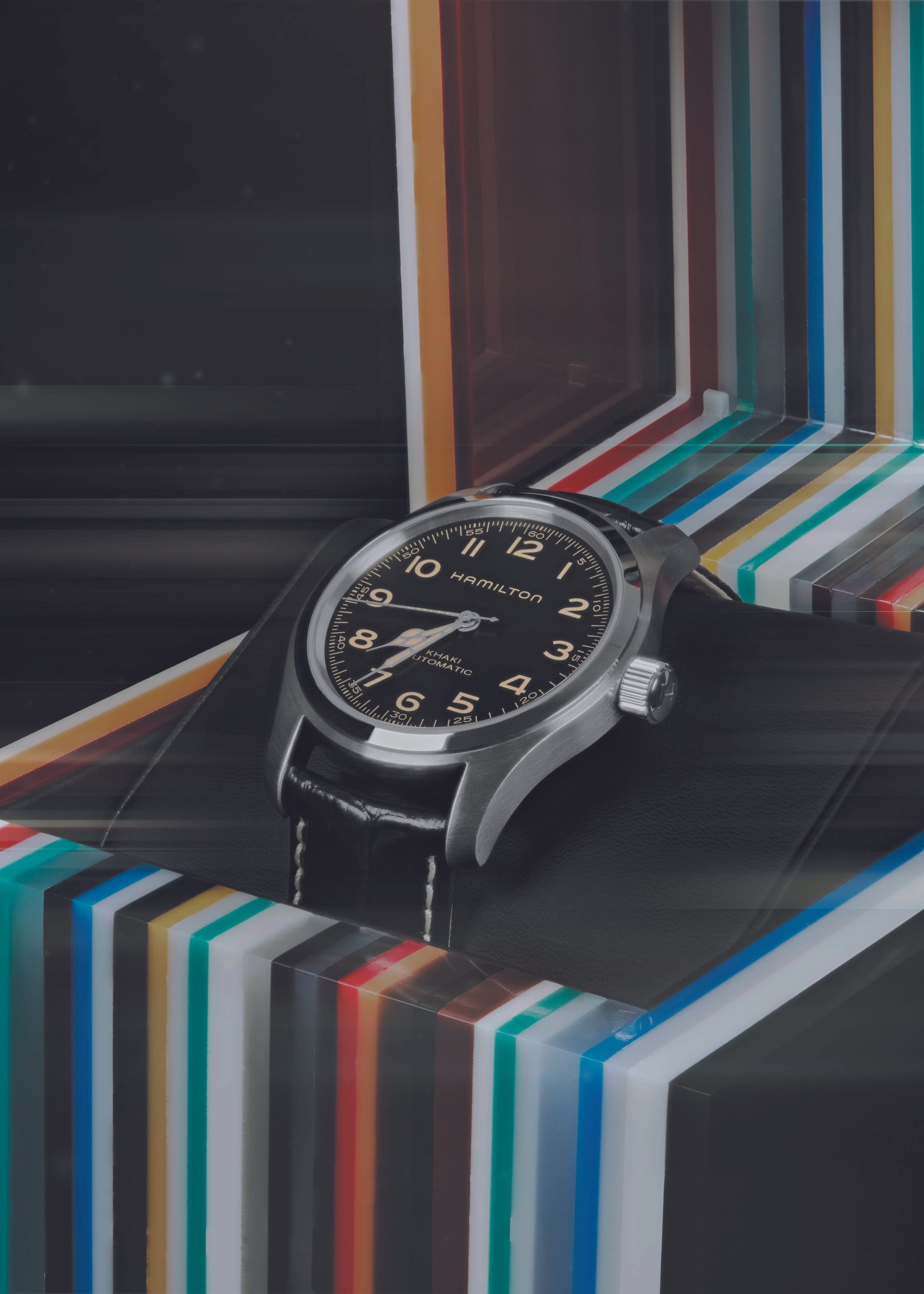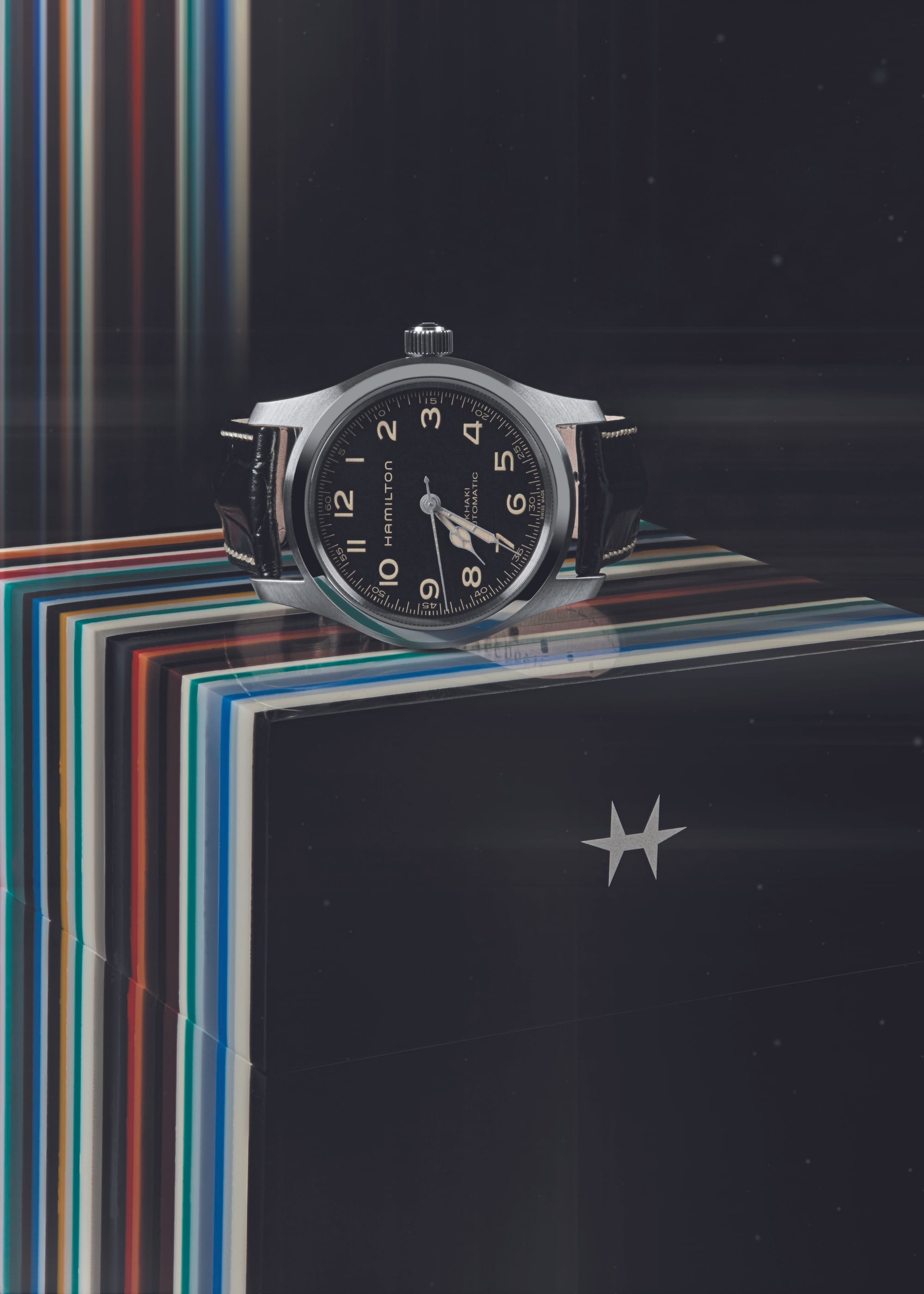 The Khaki Field Murph Auto with standard packaging 42mm is a special edition watch that celebrates the movie Interstellar, in which the main character Cooper communicates with his daughter Murph through a Hamilton watch. It features a 42mm stainless steel case, a sapphire crystal, and a solid case back that is engraved with the word “Eureka” in Morse code. It is water-resistant up to 100 meters, and has a date window at 3 o’clock. The dial is a black color that has the word “Murph” printed in the same font as the movie title. The watch is powered by the Hamilton Caliber H-10, an automatic movement that has an 80-hour power reserve. The watch comes with a black leather strap that has a pin buckle. ($995 USD, 2024)