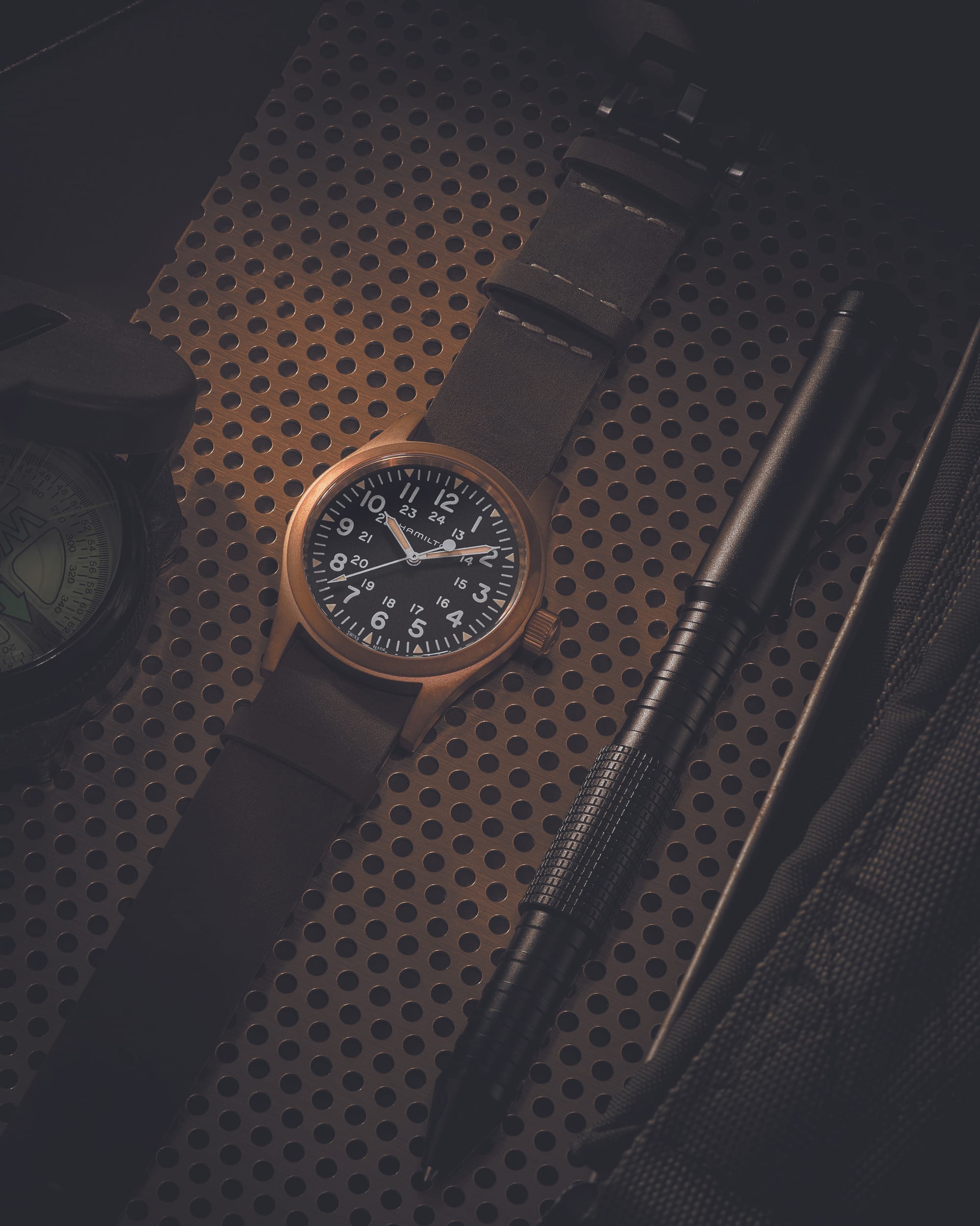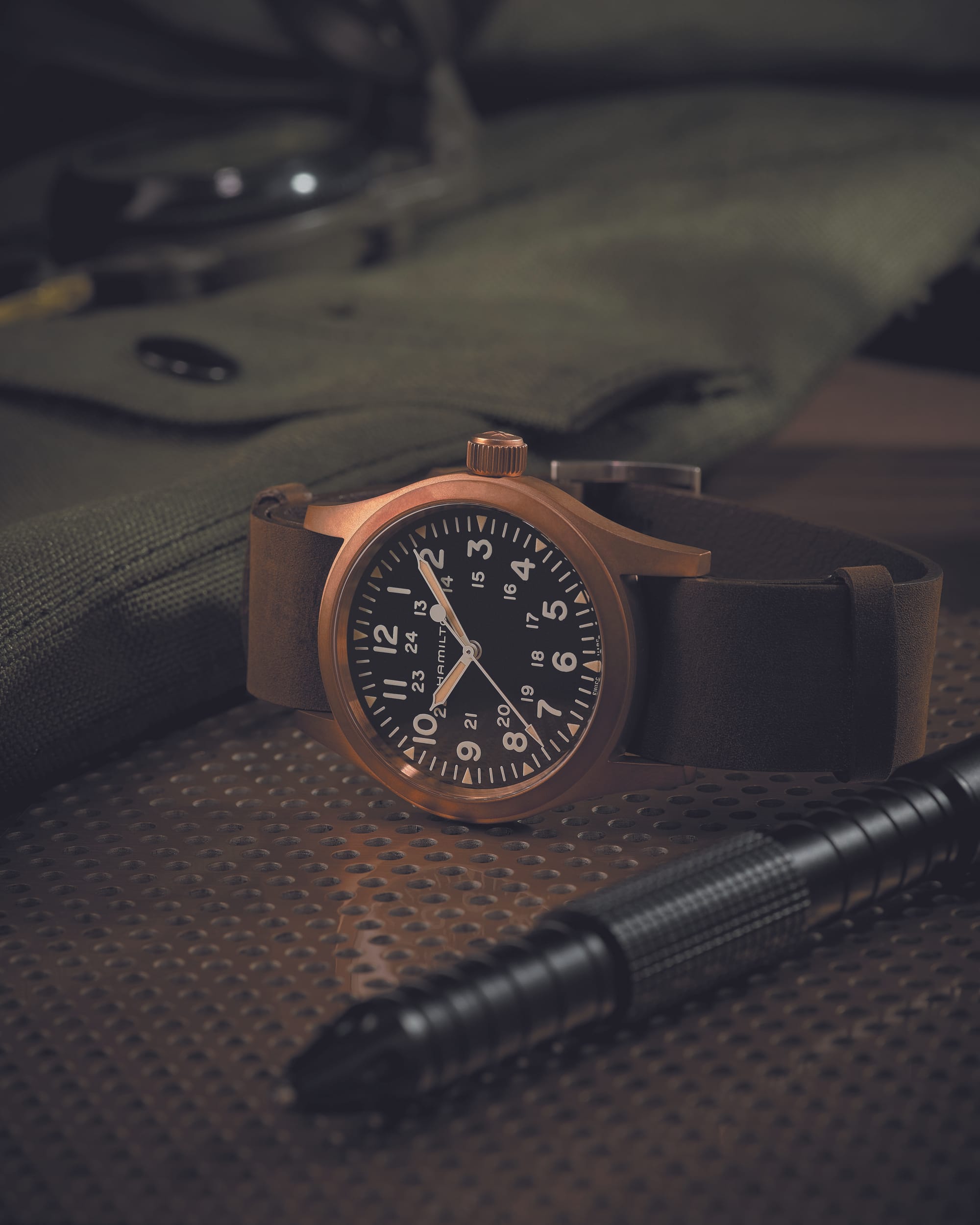 The Khaki Field Mechanical Bronze is a hand-winding field watch that combines military-inspired style with a gorgeous bronze case. This watch is faithful to the Hamilton heritage of making watches for military forces during the 20th century, and features a slim and lightweight design, a rugged black dial with luminescent markings, and a high-grade leather strap. The bronze case is a living metal that develops a unique patina over time, reflecting the wearer’s story and adventures. The Khaki Field Mechanical Bronze is powered by the exclusive H-50 movement, which provides military precision and a long power reserve. ($895 USD, 2024)
