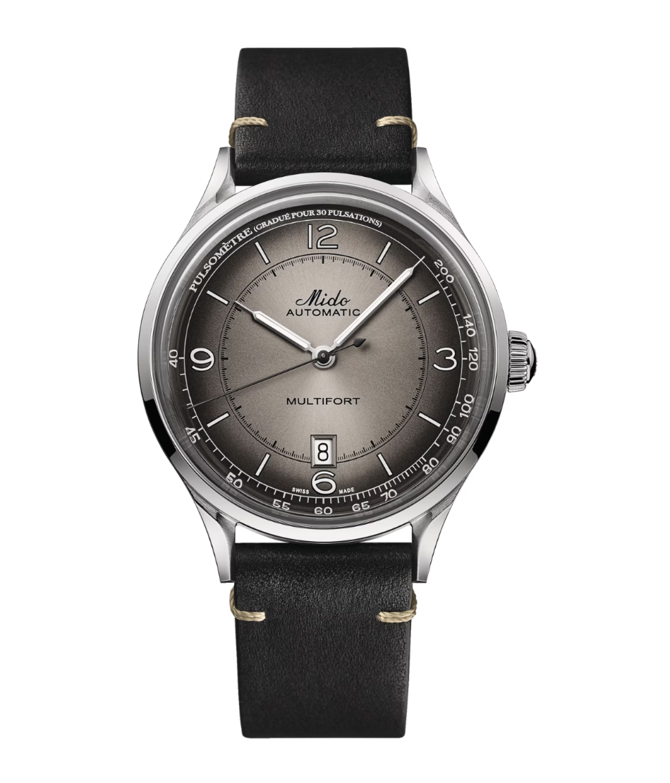 The Multifort Patrimony is a vintage-inspired watch that pays tribute to the heritage and legacy of Mido. It features a 40mm stainless steel case, a domed sapphire crystal, and a transparent case back. It is water-resistant up to 50 meters, and has a date window at 6 o’clock. The dial is a stunning Anthracite and blue colors that changes shades depending on the light. The watch is powered by the Mido Caliber 80, an automatic movement that boasts an impressive 80-hour power reserve. The watch comes with a brown leather strap that complements the dial. ($930 USD, 2024)