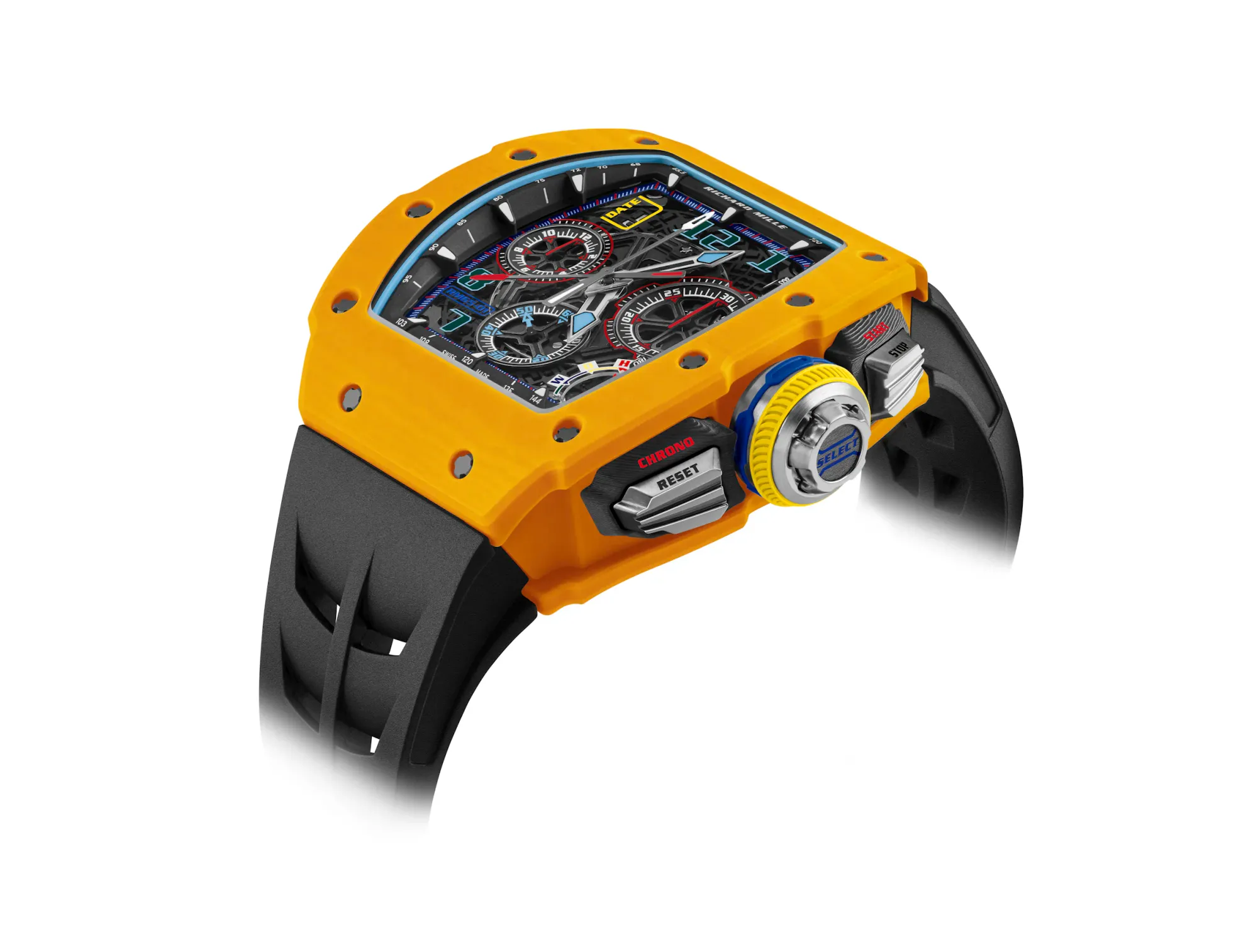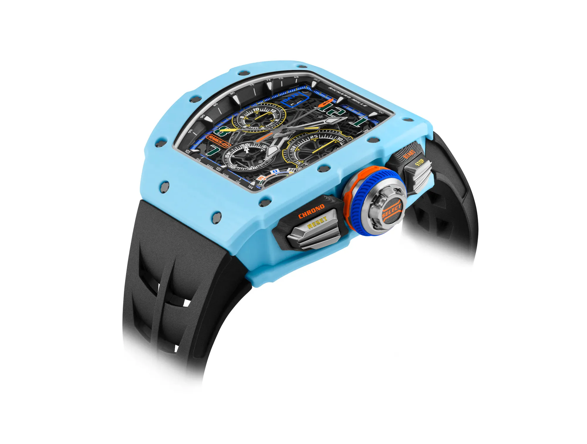 The RM 65-01’s vibrant hues enhance its allure: Yellow: The rapid-winding pusher stands out, inviting interaction. Press it, and the watch springs to life, ready for action. Blue: The split-seconds hand glides smoothly, measuring intervals with precision. Light Blue: Used for the primary timekeeping hands, it exudes understated elegance. Orange: The chronograph’s sweep seconds hand, 30-minute counter, and 12-hour totalizers wear this lively shade.