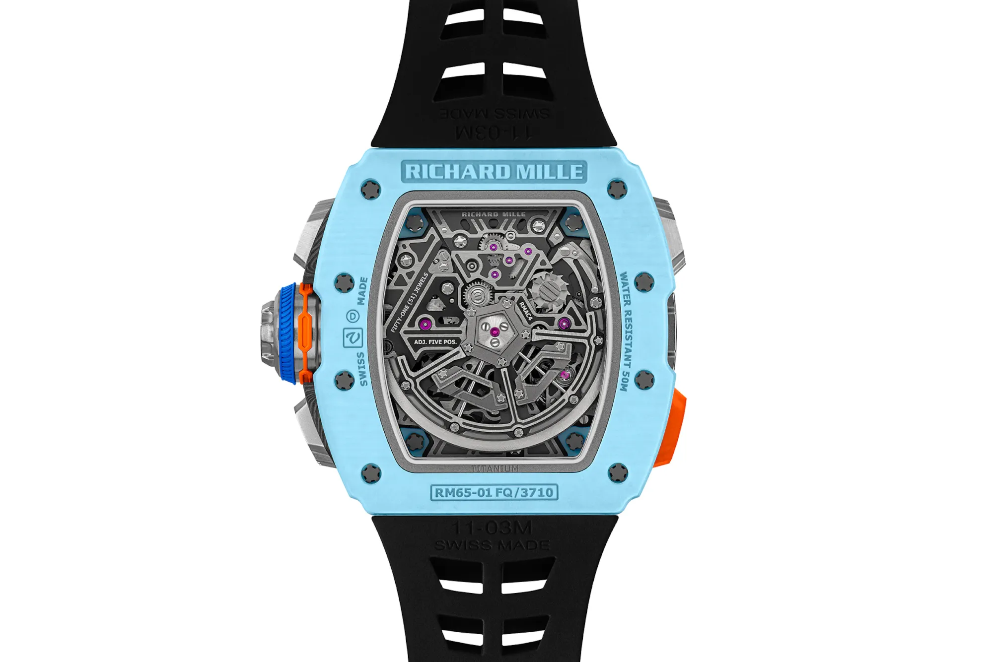 The RM 65-01, with its striking blue and yellow accents, invites us into a realm where engineering excellence dances harmoniously with design brilliance. Join me as we unravel the intricate layers of this remarkable watch, from its aerospace-grade titanium construction to its multifunctional heart—the Calibre RMAC4.