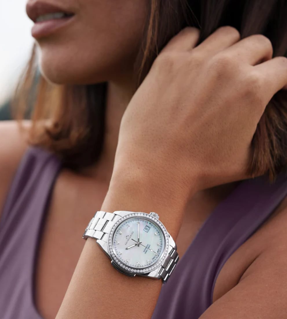 Don't be fooled by its sporty spirit. The watch exudes elegance with a scratch-resistant sapphire crystal and a choice of captivating dials: mother-of-pearl with shimmering diamond accents, or classic blue for a timeless touch.